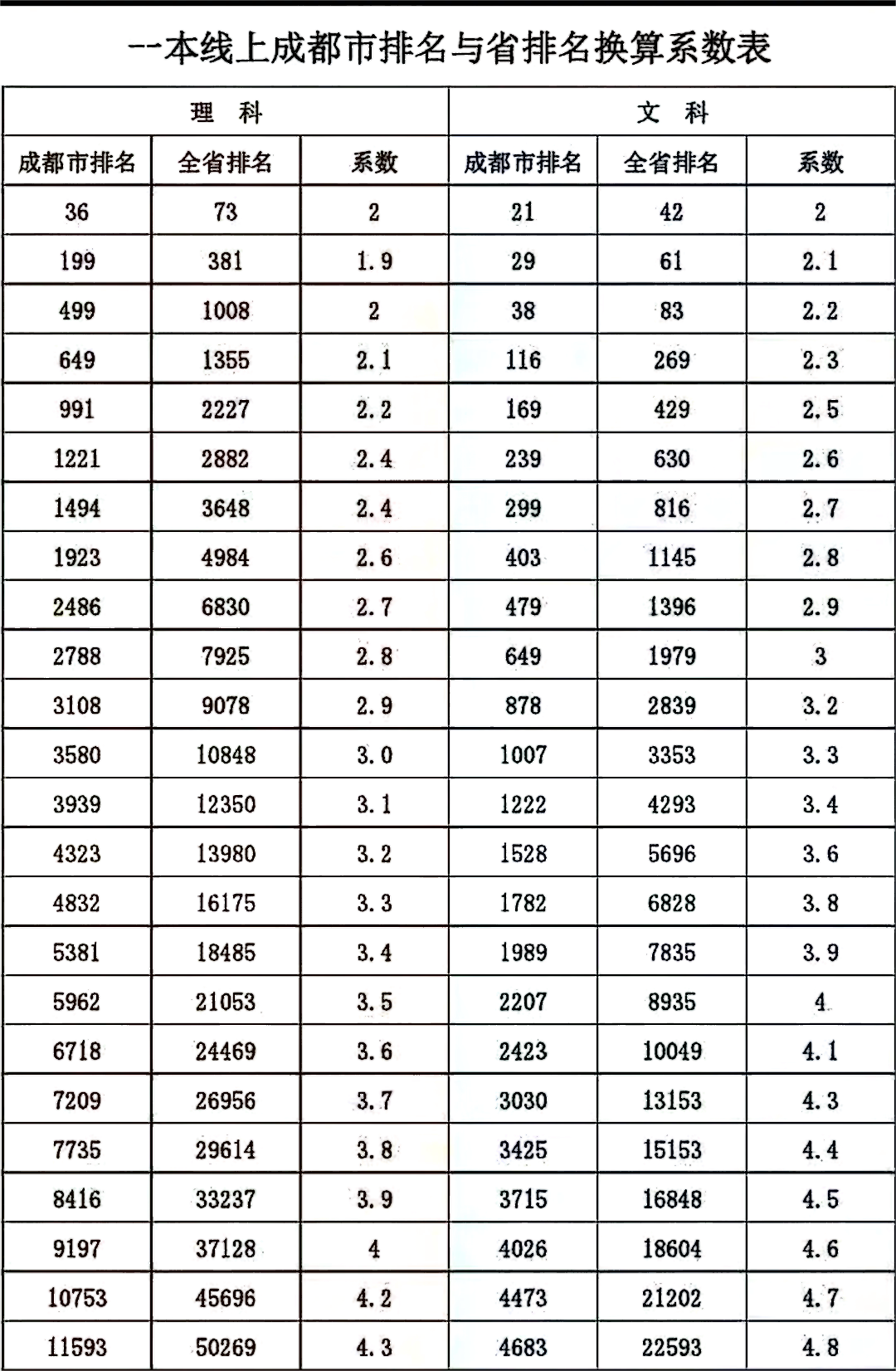 理科,成都排36名,系数是2,全省排名会在73名左右。文科成都市排名21,系数也是2,那在全省排名基本就在42名左右。简单来说,这个系数能帮我们用成都排名大概算出全省排名。要是理科生在成都排100名左右,按系数2估算,全省可能排200名左右(实际会有差别)。