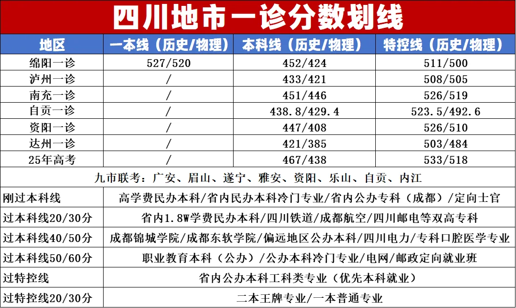 此外,以下是今年四川各地高三一诊划线情况,涵盖绵阳、泸州、南充、自贡、资阳、达州等地,供大家参考。