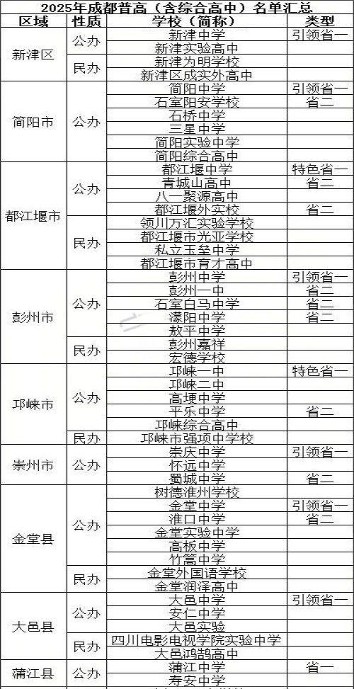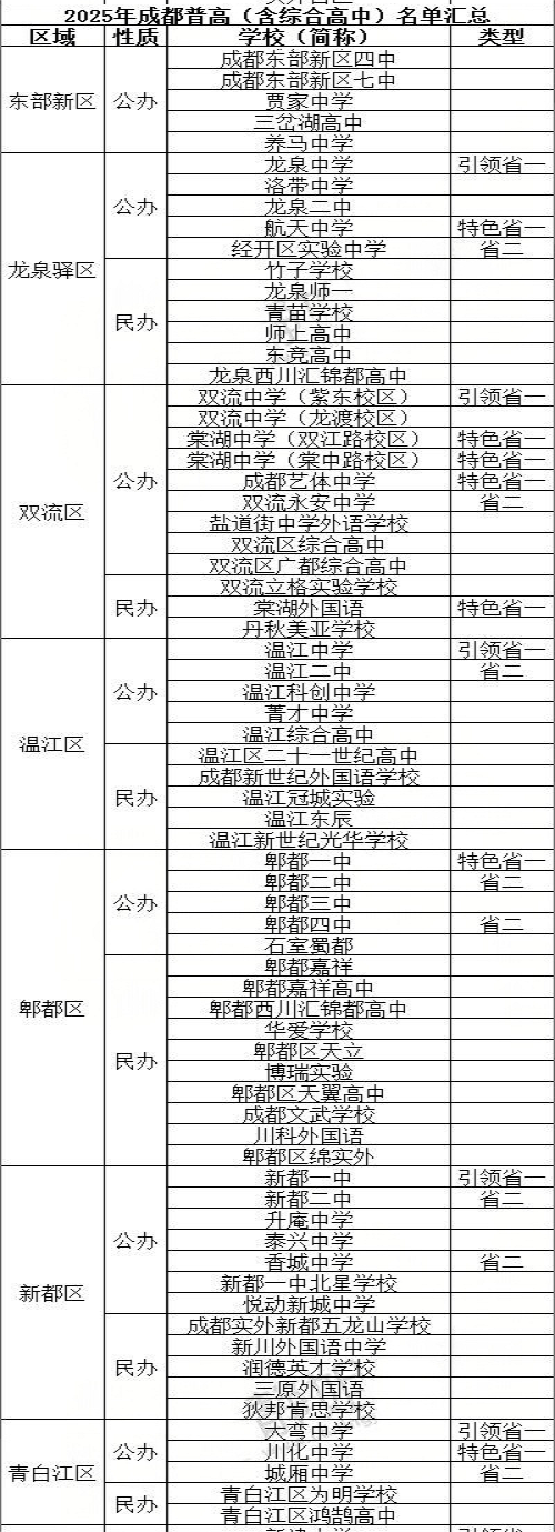 2025年成都各区域普高(含综合高中)按公办、民办分类名单汇总