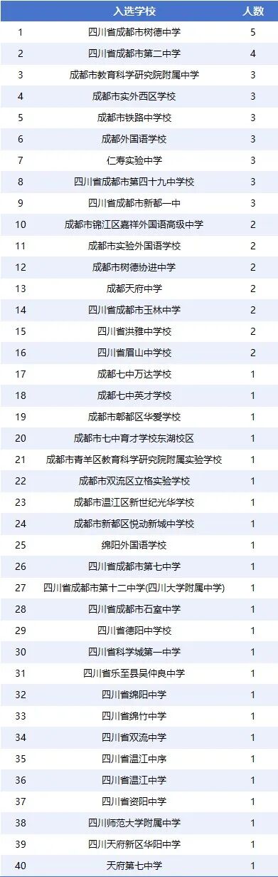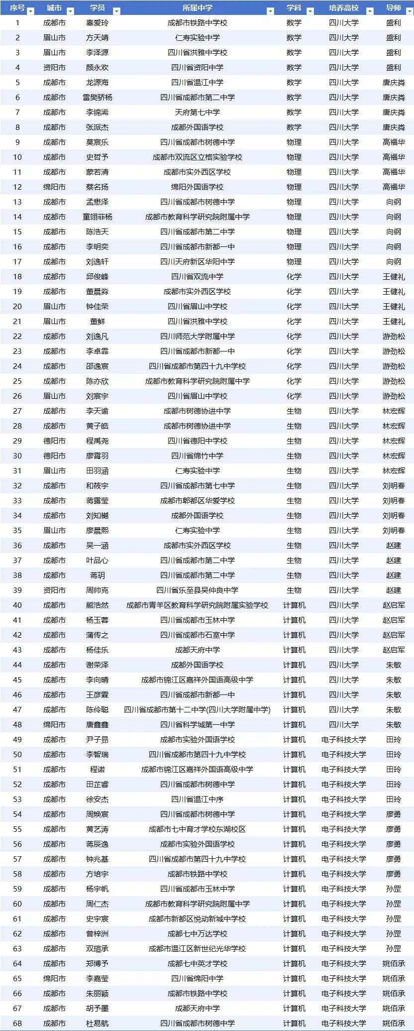 最近,2025年四川省“天府中学生英才计划”名单公示了,一共68名优秀学生入选,来自全川39所中学。成都占54人,眉山7人,绵阳3人,德阳和资阳各2人。