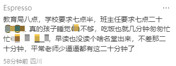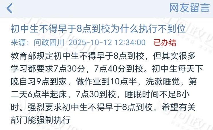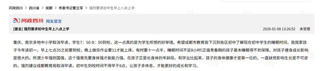 面对这样的现状,成都青羊区、锦江区、金牛区、高新区、新都区的家长们纷纷在问政平台上留言,呼吁初中生不早于8点到校的政策能够强制落地,取消早晚自习,让孩子有足够的休息时间。
