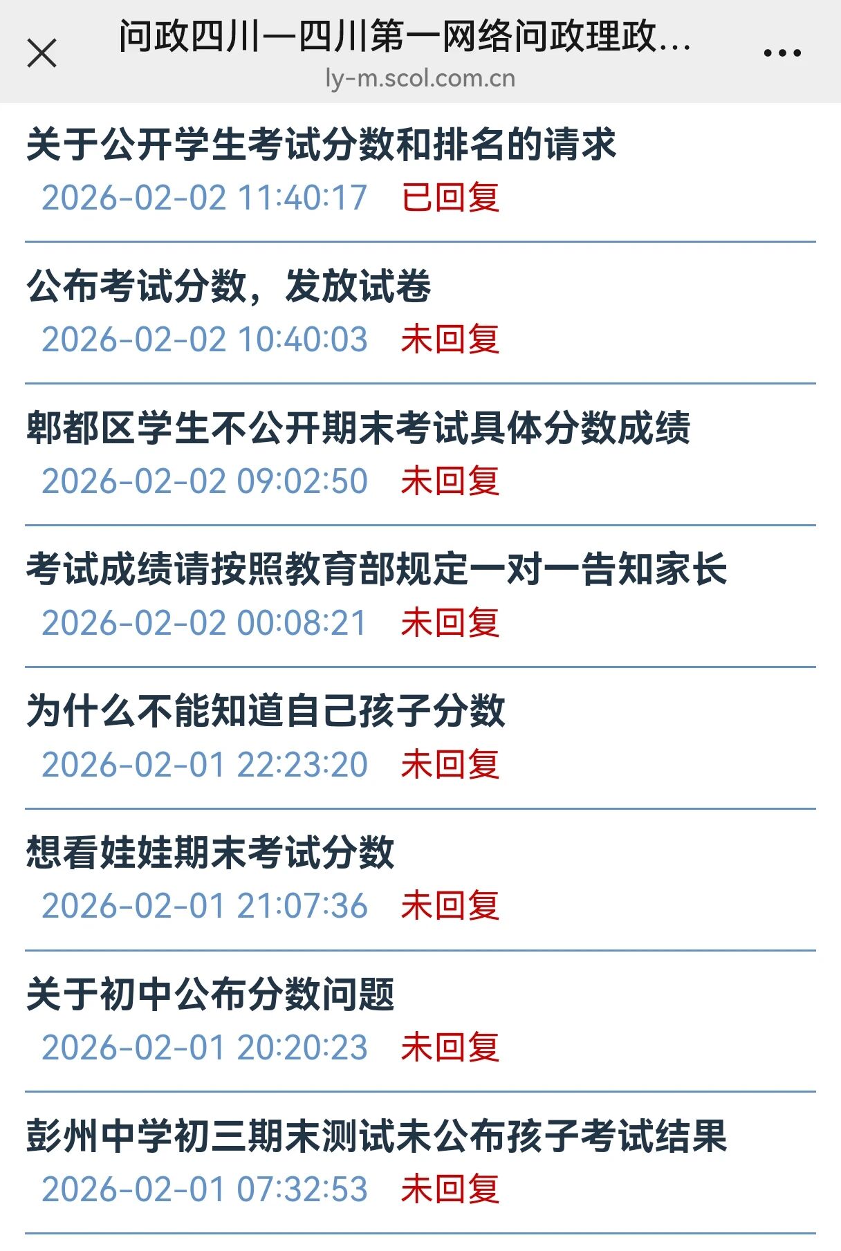 其实,期末阶段,不公布成绩、不发试卷、不展示排名,只给等级的情况并非个例,在中小学里也是普遍存在的。初三一诊成绩公布后,心急如焚的家长们多次涌入问政四川、麻辣社区等平台留言,强烈要求公开一诊分数和排名,相关留言如潮水般刷屏。